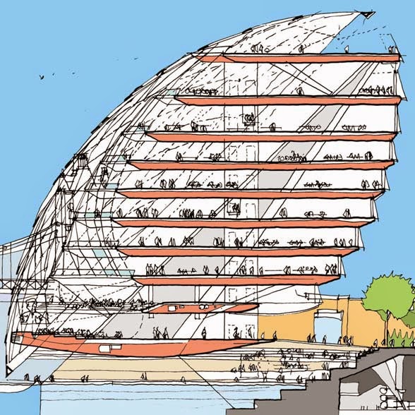 Designed using advanced computer-modelling techniques the building represents a radical rethink of architectural form. Its shape achieves optimum energy performance by maximising shading and minimising the surface area exposed to direct sunlight. Offices are naturally ventilated, photovoltaics provide power and the building’s cooling system utilises ground water pumped up via boreholes. Overall, City Hall uses only a quarter of the energy consumed by a typical air-conditioned London office building.